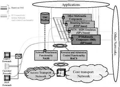 R6中的相關(guān)規(guī)范,但要求支持更多的接入方式,包括xDSL、WLAN、LAN、MAN等。此外,還定義了網(wǎng)絡(luò)附著子系統(tǒng)和資源準(zhǔn)入控制子系統(tǒng)(RACS)。在這樣的框架下,NGN可以實現(xiàn)基于SIP的業(yè)務(wù)、基于SIP-I協(xié)議傳統(tǒng)業(yè)務(wù)以及基于RTSP的業(yè)務(wù)等。ETSI