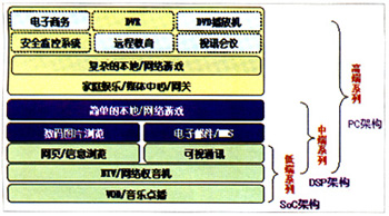 當(dāng)前國(guó)內(nèi)IPTV業(yè)務(wù)試點(diǎn)中采用的機(jī)頂盒,包括華為、中興、UT等主流廠商都主要采用了基于DSP架構(gòu)的技術(shù)解決方案,除能滿足點(diǎn)播、直播等標(biāo)清業(yè)務(wù)需求外,還可通過(guò)軟件升級(jí),以支持信息瀏覽、簡(jiǎn)單的本地/網(wǎng)絡(luò)游戲等增值業(yè)務(wù),基本上可滿足上述業(yè)務(wù)一定規(guī)模用戶商用要求。