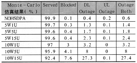 通過表3可以看出,隨著HSDPA功率分配的增加,網(wǎng)絡(luò)阻塞率和下行鏈路功率過載隨之增加,特別是功率增加到10W時,增加幅度尤為明顯;在一定的HSDPA功率分配前提下,隨著網(wǎng)內(nèi)HSDPA用戶數(shù)的增加,網(wǎng)絡(luò)阻塞率和下行鏈路功率過載隨之增加,特別是用戶數(shù)增加到15人時,增加幅度尤為明顯?梢奌SDPA網(wǎng)絡(luò)性能在一定程度上受限于HSDPA功率分配和網(wǎng)內(nèi)HSDPA用戶數(shù)。