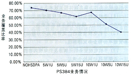 由圖1可知,當(dāng)HSDPA分配功率為5W時,HSDPA對網(wǎng)絡(luò)覆蓋沒有很大影響;當(dāng)它為10W時,如果HSDPA用戶數(shù)不大,影響也有限;但是,當(dāng)它為10W時,如果HSDPA用戶數(shù)持續(xù)增加,則會產(chǎn)生嚴(yán)重影響。在下行從NOHSDPA的74%降低到10W15U的40.62%時,PS384業(yè)務(wù)降低了近一半。同時,隨著業(yè)務(wù)速率的提高,網(wǎng)絡(luò)影響越大。另外,在一定的HSDPA功率分配前提下,隨著HSDPA用戶數(shù)的增加,過載率增大,網(wǎng)絡(luò)中高速數(shù)據(jù)業(yè)務(wù)的比例隨之減少,各點(diǎn)上的用戶速率不斷降低;同時,用戶的增多使得各小區(qū)的HSDPA發(fā)射功率不斷增大,導(dǎo)致區(qū)域中間各點(diǎn)的終端接收功率普遍增加。