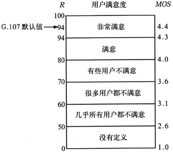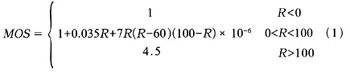 。5)MOS值,MOS模型是主觀評價方法,根據(jù)E模型MOS值是通過R值計算得到的。MOS值是1~5之間的數(shù),1是最差的,5是最好的[6]。R和MOS值的關(guān)系式如下所示: