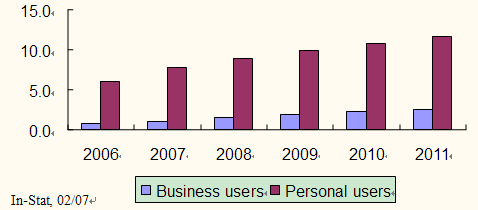 In-Stat預(yù)計(jì),到2011年中國(guó)手機(jī)電子郵件用戶(hù)達(dá)到1400萬(wàn)戶(hù),其中企業(yè)用戶(hù)達(dá)到250萬(wàn),個(gè)人用戶(hù)達(dá)到1170萬(wàn)。2007到2011年,企業(yè)用戶(hù)年均復(fù)合增長(zhǎng)率為24.8%,個(gè)人用戶(hù)年均復(fù)合增長(zhǎng)率為10.6%。如下圖所示: