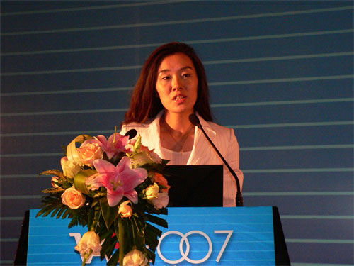 圖為NTTDoComo北京事務(wù)所對(duì)外業(yè)務(wù)高級(jí)經(jīng)理陳文雅作題為“日本3G應(yīng)用、運(yùn)營(yíng)與挑戰(zhàn)”的演講。