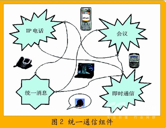 通信的終端可能是桌面電話、計算機(jī)、手機(jī)或者PDA。這4個部分之間存在緊密的聯(lián)系,比如說電話語音可以轉(zhuǎn)換為統(tǒng)一消息;電話不可達(dá)時,可以采用即時消息溝通或者小組成員可以使用多種方式參與到同一個會議中來等等。而所有這些聯(lián)系可能建立在統(tǒng)一的平臺之上: