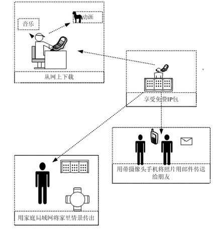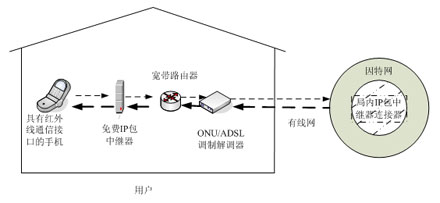 DoCoMo公司網(wǎng)里現(xiàn)有這類手機(jī)共37種),通過無線方式與免費(fèi)IP包傳輸中繼器相連,免費(fèi)IP包傳輸中繼器通過以太網(wǎng)經(jīng)過寬帶路由器或通過PPPoE(Point