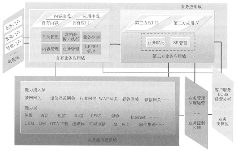 包括增值業(yè)務系統(tǒng)、業(yè)務接入網(wǎng)關系統(tǒng)等,該區(qū)域可根據(jù)業(yè)務功能細分為業(yè)務能力系統(tǒng)、業(yè)務能力接入系統(tǒng)。