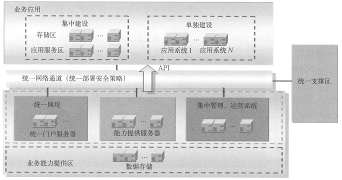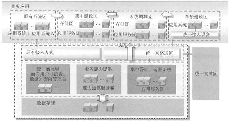 (5)應用業(yè)務區(qū):統(tǒng)一搭建應用硬件平臺,實現(xiàn)應用業(yè)務區(qū)業(yè)務應用及業(yè)務能力提供區(qū)接入通道類型的新增,均可直接在其硬件平臺上加載應用軟件、提供服務,調(diào)用現(xiàn)有資源實現(xiàn)。個別因為系統(tǒng)本身需求需要單獨建設、部署的系統(tǒng)則保留其單獨建設的方式。