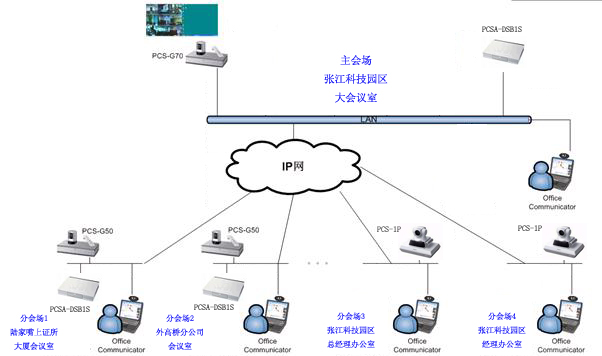 在此方案中,在張江科技園區(qū)大會(huì)議室配置一套SONY PCS-G70旗艦型視頻會(huì)議終端。并在此終端內(nèi)安裝了支持6點(diǎn)多點(diǎn)會(huì)議的H.323內(nèi)置多點(diǎn)MCU。
