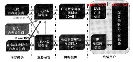 從圖2中我們可以看出,IPTV實(shí)際上有電信和廣電兩條業(yè)務(wù)通道。其中,電信的業(yè)務(wù)通道是雙向的通道,而廣電的業(yè)務(wù)通道是單向的,電視內(nèi)容提供商可以利用DVBoverIP技術(shù)通過電信業(yè)務(wù)運(yùn)營商來開展IPTV業(yè)務(wù)。寬帶/移動視頻內(nèi)容提供商也可以利用IPover