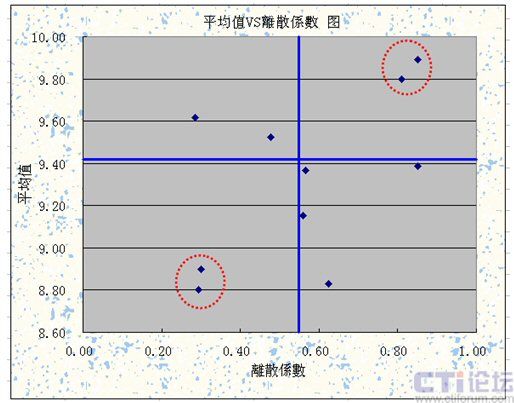 利用散點(diǎn)圖很容易找出我們的內(nèi)部標(biāo)竿,例如下面這張圖是每個班組小休率在12月份的平均值和離散系數(shù),可以清楚的看到,這四個象線的左下角,有兩個班組的小休率的平均值低于9以下,有一個班組甚至在8.8左右,這兩個班組不只是平均值最低,而且在12月份每一天的小休率也是控管的最好,差異是最小的。