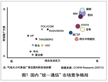 “統(tǒng)一通信”與傳統(tǒng)通信的根本區(qū)別在于不僅僅是網(wǎng)絡(luò)的融合,也是應(yīng)用的融合。從這個(gè)層面來看,“統(tǒng)一通信”真正帶給用戶的是成本的降低、工作效率的提升以及整個(gè)運(yùn)行機(jī)制的改變!敖y(tǒng)一通信”是以人性化為特征應(yīng)用層面的融合,這種融合囊括了更多的內(nèi)容、覆蓋更廣闊的領(lǐng)域、具有更大的力量,它使得通信產(chǎn)業(yè)與IT產(chǎn)業(yè),通信設(shè)備商、軟件廠商與電信運(yùn)營商之間的邊界越來越模糊,跨行業(yè)、跨領(lǐng)域的聯(lián)盟與合作成為開拓市場的必需。但隨著眾廠商的紛紛加入,多款“統(tǒng)一通信”產(chǎn)品及解決方案的推出,“統(tǒng)一通信”市場展現(xiàn)出了勃勃生機(jī)和巨大的成長潛力。在這些廠商中,有市場調(diào)研數(shù)據(jù)顯示思科市場份額領(lǐng)先,市場占有率高達(dá)35%。各類廠商之間既有競爭又有合作,但還沒有一個(gè)廠商占絕對優(yōu)勢。實(shí)際上,“統(tǒng)一通信”市場上的競爭者并不僅僅是這幾家巨頭,眾多網(wǎng)絡(luò)工具廠商、商用電話廠商也參與了這一競爭平臺。幾乎所有和ICT有關(guān)的巨頭廠商都集中在了這個(gè)領(lǐng)域,“統(tǒng)一通信”正進(jìn)入群雄爭霸的時(shí)代。國內(nèi)“統(tǒng)一通信”市場競爭格局如圖1所示。