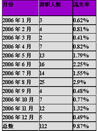 在進行收集、分析一些客服中心資料的過程中,與相關(guān)領(lǐng)導(dǎo)人員進行較深入的思想碰撞,尤其是與中國移動江蘇省客服中心副總經(jīng)理張立春的交流,尤為深刻。一組數(shù)據(jù)深深的震撼著我的思想,一是離職率2006年,僅為:9.87%,遠遠好于整個行業(yè)的平均水平;二是員工的心理健康和壓力狀況遠遠好于全國的平均水平;三是客戶服務(wù)質(zhì)量保持行業(yè)領(lǐng)先地位,各項指標(biāo)具體數(shù)值陳述如下。