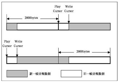 從理論上講,這已經(jīng)保證了音頻回放的流暢性。但在實(shí)現(xiàn)過程中,由于操作的對象是一幀的音頻數(shù)據(jù),其回放的時(shí)間僅是0.25秒,所以必須考慮的一個(gè)問題是程序的反應(yīng)速度問題。如果忽略由事件觸發(fā)到真正用Lock函數(shù)鎖定緩沖區(qū)的部分以進(jìn)行新數(shù)據(jù)寫入之間的時(shí)間,則這種實(shí)現(xiàn)方法沒有任何問題。除了最開始的兩幀數(shù)據(jù)外,新的一幀數(shù)據(jù)會緊跟在前一幀數(shù)據(jù)之后,彼此之間沒有重疊部分,也沒有空隙存在,能很好地達(dá)到音頻回放的流暢效果。但事實(shí)上,由事件觸發(fā)到真正用Lock函數(shù)鎖定緩沖區(qū)的部分以進(jìn)行新數(shù)據(jù)的寫入之間還必須經(jīng)過線程監(jiān)聽到事件,分析事件對應(yīng)的緩沖區(qū),然后再觸發(fā)相應(yīng)的回調(diào)函數(shù)來進(jìn)行