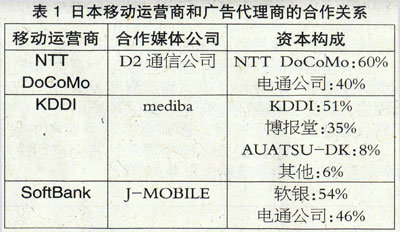 日本的移動運(yùn)營商主要采取與電通和博報(bào)堂這兩家廣告代理商合資的方式開展手機(jī)廣告業(yè)務(wù)。在運(yùn)營商和廣告代理商成立的合資媒體公司中,運(yùn)營商一般持有50%以上的股份(見表1)。