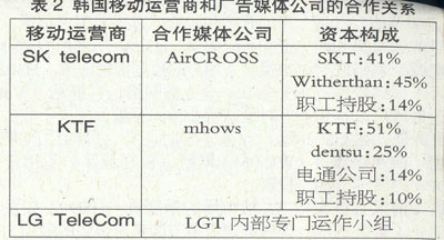 韓國的移動運(yùn)營商主要采取與廣告代理商合資的方式開展手機(jī)廣告業(yè)務(wù)(見表2)。與移動運(yùn)營商合作的Witherthan和dentsu也是在韓國數(shù)一數(shù)二的廣告代理商。