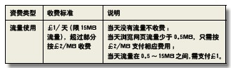 注:(1)用戶可以免費瀏覽Vodafone Live!和My Account,£1/天的數(shù)據(jù)業(yè)務資費不包括VoIP、Peer-to-Peer等業(yè)務所發(fā)生的費用,這些業(yè)務按£2/MB收費,每單位流量(KB)最少資費為5p;(2)£1費用大約可以瀏覽600個網(wǎng)頁或下載15分鐘的視頻。