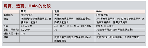惠普的Halo工作室系統(tǒng)強(qiáng)調(diào)可用于企業(yè)遠(yuǎn)程模擬面對(duì)面業(yè)務(wù)會(huì)議。通過Halo連接,每個(gè)Halo工作室可支持會(huì)議桌前排六人,第二排三至六人,最多12人的會(huì)議規(guī)模。每個(gè)工作室有三臺(tái)等離子顯示器,參會(huì)人員能夠看到與本人同樣大小的圖像。另外,參會(huì)者還可使用一個(gè)安裝在等離子顯示器上方的50英寸的協(xié)作屏幕,與其他Halo工作室中的人員共享其筆記本電腦中的文件與數(shù)據(jù)。工作室還包括一個(gè)高清圖文攝像機(jī),可用于拍攝桌上的物品并顯示在協(xié)作顯示器上,真實(shí)呈現(xiàn)色彩、陰影與細(xì)微之處。同時(shí)配備的電話讓與會(huì)者可以與Halo工作室外的人員聯(lián)系。工作室配備了廣播質(zhì)量的音頻與照明設(shè)施,參會(huì)者可以使用屏幕上簡(jiǎn)便的用戶界面,通過點(diǎn)擊鼠標(biāo)開始協(xié)作。一個(gè)復(fù)雜的軟件控制系統(tǒng)將確保各個(gè)Halo工作室輕松、無縫地協(xié)同工作。