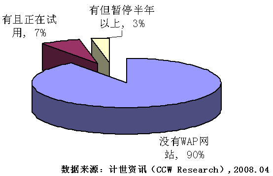 2008年3月至4月,計(jì)世資訊(CCW Research)就企業(yè)WAP網(wǎng)站建設(shè)情況對北京71家企業(yè)進(jìn)行調(diào)研,這些企業(yè)大多分布在互聯(lián)網(wǎng)、IT、電信等行業(yè)。從調(diào)研結(jié)果來看,企業(yè)WAP應(yīng)用還處于初級(jí)階段,71家企業(yè)中只有7家擁有自己的WAP網(wǎng)站,其中有兩家企業(yè)的WAP網(wǎng)站已經(jīng)暫停使用超過了半年。接受訪談的71家企業(yè)無一例外的都有自己的WEB網(wǎng)站,與企業(yè)WEB網(wǎng)站相比,企業(yè)WAP網(wǎng)站普及程度還很低。