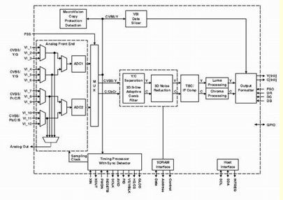圖2所示為視頻解碼器的數(shù)據(jù)流路徑,它負(fù)責(zé)處理NTSC、PAL、SECAM、S-Video、SCART、YPbPr、RGB、480p和其它輸入格式。在數(shù)字電視中,對這種級別的靈活性的支持是必需的,完全是為了讓一個機型經(jīng)過實際設(shè)置可以工作于任何格式。數(shù)字電視解碼器的典型性能特征包括:同步、消隱、場、有源視頻窗口、水平和垂直同步、時鐘、同步鎖相(用于下行視頻編碼同步)、主CPU中斷和可編程邏輯I/O信號。這是對數(shù)字視頻輸出以及用于先進的垂直消隱期(VBI)數(shù)據(jù)恢復(fù)的補充。作為一種附加功能,一些視頻解碼器支持VBI數(shù)據(jù)處理器(VDP)在文字電視廣播、傳送字幕(CC)和其它VBI數(shù)據(jù)上進行數(shù)據(jù)分片、解析和執(zhí)行誤碼校驗。內(nèi)置的FIFO存儲多達(dá)11行文字電視廣播數(shù)據(jù),而適當(dāng)?shù)闹鹘涌谕郊叭聊晃淖蛛娨晱V播恢復(fù)是當(dāng)今系統(tǒng)中的幾個常見要求。然而,一些實現(xiàn)方案需要一種解碼器,它能夠為基于主CPU的VBI處理提供速度為已采樣原始亮度數(shù)據(jù)兩倍的輸出格式化數(shù)據(jù)。