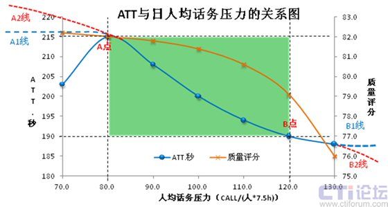 1. 人均話務(wù)壓力在80~120區(qū)間,ATT在215~190呈線性下降;