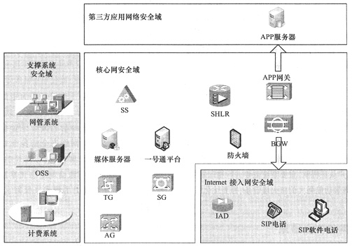 核心網(wǎng)安全域包括所有的軟交換機(jī),TG、AG、SG等接入網(wǎng)關(guān),BGW類設(shè)備,關(guān)鍵業(yè)務(wù)平臺(tái)(包括SHLR、號(hào)碼轉(zhuǎn)換平臺(tái)等),軟交換媒體服務(wù)器和應(yīng)用服務(wù)器,開發(fā)給第三方業(yè)務(wù)接口的應(yīng)用網(wǎng)關(guān)。Internet接入網(wǎng)安全域包括所有分配公網(wǎng)地址的SIP電話終端、IAD類設(shè)備、各類SIP接入的PC等。支撐系統(tǒng)安全域包括網(wǎng)管、計(jì)費(fèi)和OSS等輔助運(yùn)營系統(tǒng)。第三方應(yīng)用網(wǎng)絡(luò)安全域主要包括所有以開發(fā)業(yè)務(wù)接口方式接入的應(yīng)用服務(wù)器,鑒于目前實(shí)際應(yīng)用中很少涉及到這種應(yīng)用,這里不討論該區(qū)域的安全需求。