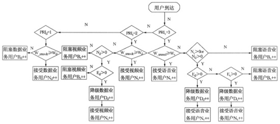 1)用戶到達事件。當(dāng)帶寬資源充裕時,各類用戶到達不論優(yōu)先級高低,均可按需分配得到帶寬。當(dāng)帶寬資源不能滿足接入需求帶寬時,則按照優(yōu)先級順序從低到高對已接入的用戶進行QoS降級服務(wù)(降一級或若干級),直到能夠騰出足夠的帶寬滿足新用戶的需求,否則阻塞該用戶,具體流程如圖2所示。