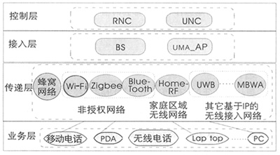 (3)在目前頻譜資源有限的情況下,UMA使用免費(fèi)的ISM頻段,拉開了移動(dòng)終端大規(guī)模利用“最后一公里帶寬”接GSM/GPRS核心網(wǎng)的序幕,使運(yùn)營商向移動(dòng)用戶提供話音推送、VoIP、視頻服務(wù)等高帶寬業(yè)務(wù)成為可能。