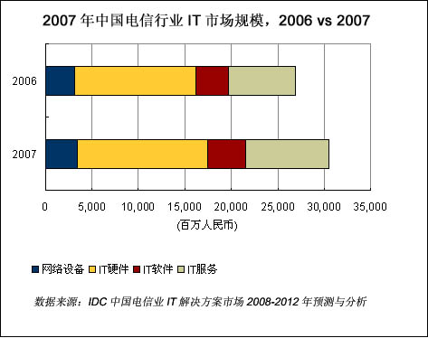 IDC《中國電信行業(yè)IT解決方案市場2008-2012年預(yù)測與分析》報告的數(shù)據(jù)顯示,2007年中國電信行業(yè)整體IT支出規(guī)模為305.02億元人民幣,比2006年增長了13.2%。2007年電信行業(yè)IT運(yùn)營支撐系統(tǒng)和增值業(yè)務(wù)系統(tǒng)的高速增長主要是由于運(yùn)營商都在為3G的實(shí)施和全業(yè)務(wù)運(yùn)營做準(zhǔn)備。