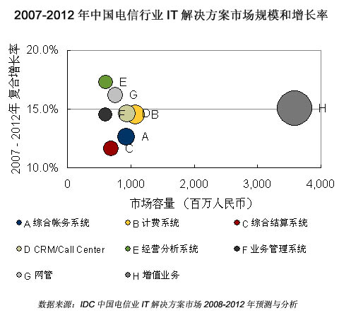 IDC預(yù)計(jì),2007-2012年電信行業(yè)將注重運(yùn)營支撐系統(tǒng)的全業(yè)務(wù)運(yùn)營整合和支持前端業(yè)務(wù),因此3G增值業(yè)務(wù)、經(jīng)營分析系統(tǒng)、客戶關(guān)系管理系統(tǒng)、IT服務(wù)管理系統(tǒng)等建設(shè)將實(shí)現(xiàn)快速增長。已有項(xiàng)目仍然會持續(xù)升級維護(hù),以及配合全業(yè)務(wù)運(yùn)營作出功能上的提升。2007年電信IT應(yīng)用解決方案(僅含解決方案供應(yīng)商自有軟件及其相關(guān)服務(wù)包括BSS/OSS/MSS/VAS)市場規(guī)模為97.27億元人民幣,占整體電信軟件和服務(wù)市場容量的74.5%。2012年電信行業(yè)IT解決方案整體市場規(guī)模將達(dá)到193.5億元人民幣。