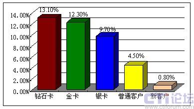 因為高端客戶在利潤貢獻中所起的巨大作用,通過簡單的計算即可得出,每一名鉆石卡客戶流失帶來的利潤損失,相當于9.4名銀卡客戶流失帶來的損失,或相當于50名普通客戶流失帶來的損失,或相當于125名新用戶流失帶來的直接損失。