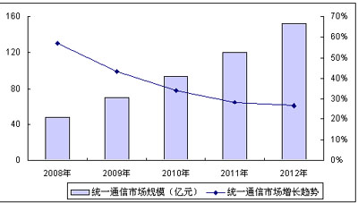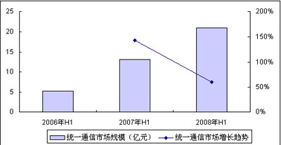 統(tǒng)一通信作為一種以融合技術為基本特征的特定解決方案和應用,通過對各種溝通方式進行有效的融合,滿足用戶方便快捷的信息獲取和溝通需求,近年來在全球范圍內(nèi)得到了迅猛發(fā)展,各大通信與信息技術相關廠商紛紛加入統(tǒng)一通信市場的競爭中。賽迪顧問數(shù)據(jù)統(tǒng)計顯示,2008年上半年,中國統(tǒng)一通信整體市場規(guī)模已達到21.01億元,同比增長超過60.9%,繼續(xù)保持強勁的增長勢頭。