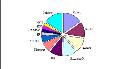 各大通信與IT廠商都在厲兵秣馬,充分挖掘企業(yè)的自身優(yōu)勢,準備在潛力巨大的統(tǒng)一通信市場中取得良好戰(zhàn)績。賽迪顧問數(shù)據(jù)顯示,2008年上半年,中國統(tǒng)一通信市場中,Cisco公司以15.3%的市場份額繼續(xù)保持領頭樣的位置,在通信設備領域,Nortel和Avaya分別以12.1%和11.7%的市場份額緊隨其后。值得一提的是Microsoft和IBM以其在全球獨一無二的終端用戶,迅速占領統(tǒng)一通信軟件市場,無論是市場份額還是整體競爭力都成績不俗,且增長勢頭強勁。各大廠商短時間的涌入,使得統(tǒng)一通信市場出現(xiàn)了前所未有的群雄逐鹿的局面,競爭異常激烈。