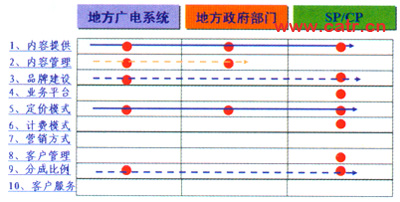 在投資與收益方面,雙方共同出資,成立公司,調(diào)動雙方相關(guān)的優(yōu)勢資源。并且協(xié)調(diào)了與SP/CP、政府、行業(yè)部門等多方面原本復(fù)雜的關(guān)系。能夠增加的收入是點播和直播節(jié)目收費。收費模式方面增加電視包月費、頻道組合費。合作分成通過股份公司分紅。