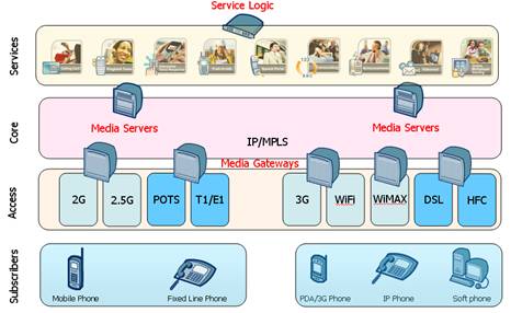 在下一代增值業(yè)務網絡里,業(yè)務平臺由一系列不同功能的應用服務器組成,同時為固網/移動/IP客戶提供增值業(yè)務。以彩鈴業(yè)務平臺為例,彩鈴的簽約用戶可以是移動用戶,也可以是固定電話,小靈通用戶或IP用戶;系統(tǒng)也會根據終端的能力和簽約類型,自動選擇是提供音頻彩鈴或視頻彩鈴業(yè)務。