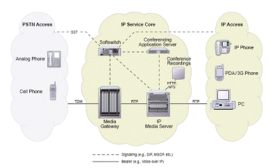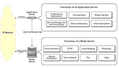 在這個網絡中,業(yè)務平臺需要引入通用的媒體資源處理平臺:IP媒體服務器。IP媒體服務器用來提供音頻,視頻,DTMF,TTS/ASR,F(xiàn)AX等媒體處理功能,為整個業(yè)務網絡提供增值服務。