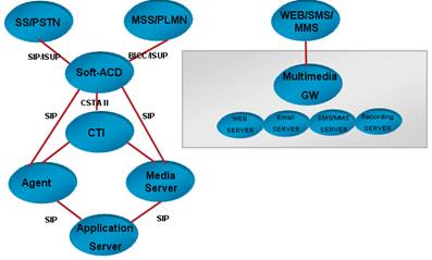 目前市場最常見的第三代呼叫中心是傳統(tǒng)的基于TDM的呼叫中心,應用了計算機電話集成(CTI)技術。隨著網絡的普及和NGN的發(fā)展,出現(xiàn)第五代呼叫中心NGCC。NGCC是以NGN為基礎構建的呼叫中心系統(tǒng),核心控制設備處理呼叫的能力較傳統(tǒng)呼叫中心大幅提高。NGCC的網絡架構和接口如圖3所示。