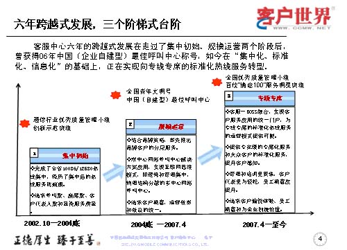 三個(gè)階段可以分為集中初始的02年10月到04年,規(guī)模運(yùn)營(yíng)是04年底到07年的4月,那么07年4月至今已經(jīng)是專線專席運(yùn)營(yíng)。我們的重點(diǎn)是在規(guī)模運(yùn)營(yíng)和專線專席上有所突破,規(guī)模運(yùn)營(yíng)主要是結(jié)合品牌策略,率先推出的是品牌客戶分層服務(wù);雙中心網(wǎng)絡(luò)呼叫中心解決方案應(yīng)用,實(shí)現(xiàn)互聯(lián)網(wǎng)思維模式及邏輯管理集中,物理結(jié)構(gòu)分散的多中心網(wǎng)絡(luò)呼叫中心;追求客戶滿意,運(yùn)營(yíng)效率和效益的統(tǒng)一。07年開(kāi)始,我們重點(diǎn)實(shí)現(xiàn)客服系統(tǒng)與業(yè)務(wù)BOSS系統(tǒng)的全面融合,實(shí)現(xiàn)客戶服務(wù)應(yīng)用的統(tǒng)一門戶。也就是說(shuō),無(wú)論是我們的電話服務(wù)、營(yíng)業(yè)廳的服務(wù),還是客戶經(jīng)理的上門服務(wù),都應(yīng)用于客戶服務(wù)的統(tǒng)一門戶,實(shí)現(xiàn)著CRM的客戶關(guān)系管理。對(duì)于電話服務(wù)來(lái)講,我們以標(biāo)準(zhǔn)化、專業(yè)化的熱線服務(wù)運(yùn)營(yíng)模式,提升專家級(jí)的精細(xì)化服務(wù)和大眾客戶的標(biāo)準(zhǔn)化服務(wù),使得管理和培訓(xùn)更聚焦,客戶代表更為輕松,同時(shí)也提高了員工滿意度,實(shí)現(xiàn)了追求客戶愉悅體驗(yàn)、員工滿意和為企業(yè)創(chuàng)造價(jià)值。