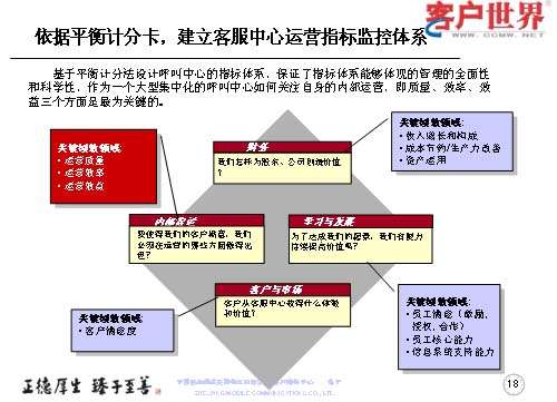 我們依據(jù)平衡計(jì)分卡來(lái)建立客服中心運(yùn)營(yíng)指標(biāo)監(jiān)控體系,作為呼叫中心的一個(gè)指標(biāo)體系來(lái)講,基于平衡計(jì)分方法的主要有四大領(lǐng)域:關(guān)鍵績(jī)效領(lǐng)域,重點(diǎn)是運(yùn)營(yíng)質(zhì)量,運(yùn)營(yíng)效率和運(yùn)營(yíng)效益,這個(gè)主要涉及到內(nèi)部運(yùn)營(yíng)管理;財(cái)務(wù)領(lǐng)域是收入增長(zhǎng)、構(gòu)成、成本節(jié)約、生產(chǎn)力改善和資產(chǎn)運(yùn)用,這是一個(gè)企業(yè)經(jīng)營(yíng)目標(biāo);學(xué)習(xí)與發(fā)展關(guān)注的是員工滿意(激勵(lì)、授權(quán)、合作),員工核心能力,信息系統(tǒng)支持能力;客戶與市場(chǎng),甚至客戶從接受服務(wù)當(dāng)中獲得的體驗(yàn)和價(jià)值,以提高客戶滿意度。我們重點(diǎn)的是在內(nèi)部運(yùn)營(yíng)上著力,下決心做好質(zhì)量、效率和效益的三提升。