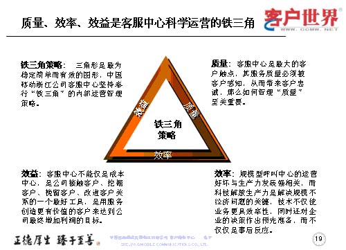 應(yīng)該說(shuō)這三個(gè)方面是科學(xué)運(yùn)營(yíng)的一個(gè)鐵三角,這是我們的理解,因?yàn)槿切危冀K認(rèn)為是最穩(wěn)定、簡(jiǎn)單、有效的圖形,也是我們?cè)谶M(jìn)行內(nèi)部運(yùn)營(yíng)的管理鐵架。質(zhì)量是客服中心最大的觸點(diǎn)當(dāng)中被客戶感知,從而帶來(lái)客戶忠誠(chéng)的,如何管理質(zhì)量,那就至關(guān)重要。效率尤其是規(guī)模型的呼叫中心的運(yùn)營(yíng)好壞,是與生產(chǎn)力的發(fā)展強(qiáng)相關(guān),而科技解放生產(chǎn)力是解決規(guī)模問(wèn)題的關(guān)鍵。技術(shù)不僅是運(yùn)行更具效益率,同時(shí)還對(duì)企業(yè)的決策作出預(yù)先準(zhǔn)備,而不僅僅是事后反應(yīng)。很多年來(lái),更多的企業(yè)是把客服中心視為成本中心,而事實(shí)上,效益的顯現(xiàn)讓我們陸續(xù)地走出了成本中心,它應(yīng)該是公司接觸客戶、挖掘客戶、挽留客戶、改進(jìn)客戶關(guān)系的一個(gè)最好工具,是用服務(wù)創(chuàng)造更有價(jià)值的客戶,來(lái)達(dá)到公司最終增加利潤(rùn)的目標(biāo)。
