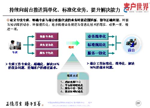設(shè)立專線專席,并不是指專線越專越多,而是持續(xù)地向前臺(tái)推送簡(jiǎn)單化、標(biāo)準(zhǔn)化的業(yè)務(wù),提升前臺(tái)一線的解決能力,所以我們重點(diǎn)以專線的技能專業(yè)化、業(yè)務(wù)復(fù)雜化、服務(wù)個(gè)性化,然后把簡(jiǎn)單的形成規(guī)范標(biāo)準(zhǔn)的業(yè)務(wù)向前臺(tái)推送,保障專席的工作是專業(yè)化、精確化地解決10%的復(fù)雜問(wèn)題,從而更多地去挖掘客戶的需求。而前臺(tái)客服的工作是用標(biāo)準(zhǔn)化、簡(jiǎn)單化地解決90%的基本問(wèn)題。