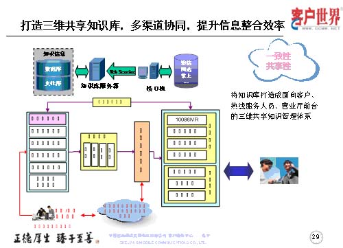 打造三維共享知識(shí)庫(kù),多渠道協(xié)同,提升信息整合效率。我們的知識(shí)庫(kù)服務(wù)器是基于客戶系統(tǒng)的大平臺(tái),形成熱線服務(wù)人員、營(yíng)業(yè)廳人員,乃至客服經(jīng)理的三維共享知識(shí)庫(kù)共享,以保障了服務(wù)的一致性,服務(wù)渠道的共享性。