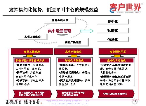 作為集中管理來(lái)講,突出“三高”,運(yùn)用好“三高”體現(xiàn)的是如何進(jìn)行集中化、標(biāo)準(zhǔn)化和信息化。我們從高員工滿意度,高客戶滿意度和高資源利用率入手,高員工滿意度主要是應(yīng)用平臺(tái)和科學(xué)的管理方法,使得員工的技能持續(xù)提升,員工的自身收入也按單位時(shí)間而增長(zhǎng);高客戶滿意度是用標(biāo)準(zhǔn)化和規(guī)范化來(lái)進(jìn)一步優(yōu)化流程,改進(jìn)操作,對(duì)于目標(biāo)客戶及時(shí)回訪,有效地延長(zhǎng)公司產(chǎn)品的客戶使用生命周期,以創(chuàng)造公司的最大利益;作為集中化的呼叫中心,系統(tǒng)已經(jīng)投入了較大的座席規(guī)模,高資源利用率是如何把這些座席和系統(tǒng)的規(guī)模應(yīng)用得更好,使得我們的產(chǎn)品能夠進(jìn)一步地推向市場(chǎng),被客戶所接受,所以我們采取了更多的整合呼出渠道,精確營(yíng)銷,尤其對(duì)公司的存量客戶進(jìn)行持續(xù)維系的關(guān)鍵時(shí)刻,達(dá)到營(yíng)銷與服務(wù)效率的最大化。