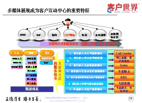中國(guó)移動(dòng)集團(tuán)的呼叫中心大會(huì)已經(jīng)提出了多媒體呼叫中心模型,對(duì)于多媒體展現(xiàn)是成為客戶互動(dòng)中心的重要特征,是基于更多的觸點(diǎn),也就是說(shuō)基于更多的多媒體觸點(diǎn),以互聯(lián)網(wǎng)的方式來(lái)建立服務(wù)體系的開(kāi)放、分享、互動(dòng)和娛樂(lè)。