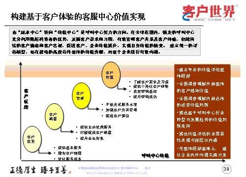 從客戶接受到客戶滿意、客戶忠誠(chéng)和客戶價(jià)值提升,建立統(tǒng)一的評(píng)估模型,站在戰(zhàn)略的高度來(lái)看待整體的客服中心價(jià)值貢獻(xiàn),對(duì)企業(yè)進(jìn)行有效的溝通。這就是說(shuō)我們建立的是專業(yè)的價(jià)值評(píng)估整體框架,全面調(diào)查、理解外部的客戶感知價(jià)值,全面調(diào)查理解內(nèi)部的運(yùn)營(yíng)價(jià)值來(lái)判斷,提出基于呼叫中心行業(yè)轉(zhuǎn)型與發(fā)展趨勢(shì)的價(jià)值判斷走向,提升價(jià)值評(píng)估的主要顯性表現(xiàn)與深層次內(nèi)涵,在整體框架基礎(chǔ)上,建立企業(yè)內(nèi)外溝通的實(shí)施方案。