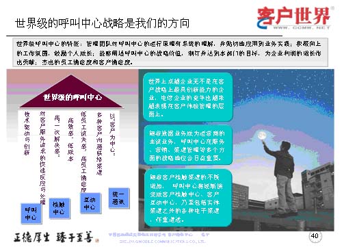 最后我想世界級(jí)的呼叫中心戰(zhàn)略是我們從事客戶服務(wù)行業(yè),從事呼叫中心人的方向,從我們理解的世界級(jí)呼叫中心特征來(lái)講,管理團(tuán)隊(duì)?wèi)?yīng)對(duì)呼叫中心的運(yùn)營(yíng)原理有系統(tǒng)的理解,并貼切地應(yīng)用到業(yè)務(wù)實(shí)踐,創(chuàng)造積極向上的工作氛圍,鼓勵(lì)員工成長(zhǎng),能夠闡述呼叫中心的戰(zhàn)略價(jià)值,制訂并達(dá)到本部門的目標(biāo),為企業(yè)利潤(rùn)的增長(zhǎng)作出杰出的貢獻(xiàn),杰出的員工滿意度和客戶滿意度。所以世界級(jí)呼叫中心我們理解是從七個(gè)方面來(lái)衡量,以“客戶為中心”,多種客戶溝通的聯(lián)絡(luò)渠道,低員工流失率和高客戶滿意度,高效率、低成本,高“一次性解決率”,對(duì)客戶服務(wù)請(qǐng)求的快速反應(yīng)與處理,技術(shù)驅(qū)動(dòng)與創(chuàng)新。