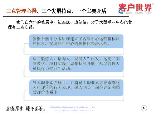 在這六年中,我們有三點(diǎn)管理心得,三個(gè)發(fā)展特點(diǎn),一個(gè)主要矛盾。我們邊實(shí)踐邊總結(jié),對(duì)大型呼叫中心運(yùn)營(yíng)的管理有三點(diǎn)心得: