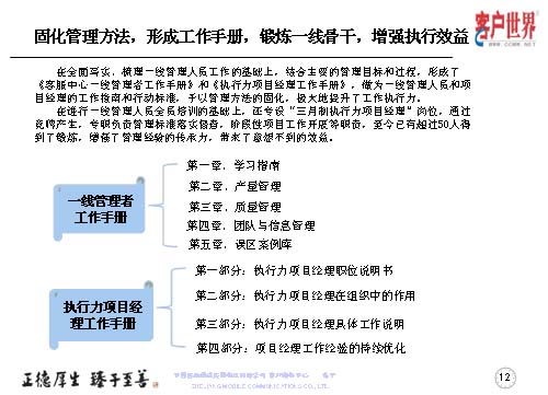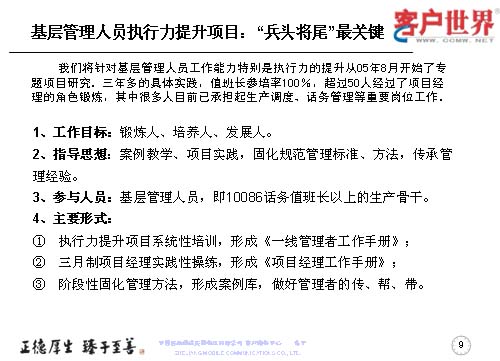 大家知道基層管理人員其實(shí)是兵頭將尾的最關(guān)鍵,我們將對(duì)基層管理人員的工作能力,特別是執(zhí)行力的提升是從05年8月份就開(kāi)始了專項(xiàng)研究,三年多的具體實(shí)踐,值班長(zhǎng)的培訓(xùn)率達(dá)到100%,超過(guò)50人經(jīng)過(guò)了項(xiàng)目經(jīng)理的角色鍛煉,目前很多擔(dān)任過(guò)項(xiàng)目經(jīng)理的已經(jīng)承擔(dān)了生產(chǎn)調(diào)度、話務(wù)管理等重要的管理崗位。在這個(gè)項(xiàng)目當(dāng)中,我們從四個(gè)方面入手,工作目標(biāo)是鍛煉人、培養(yǎng)人、發(fā)展人。指導(dǎo)思想是案例教育、項(xiàng)目實(shí)踐,固化規(guī)范管理標(biāo)準(zhǔn)、方法,傳承管理經(jīng)驗(yàn)。參與人員就是基層管理人員,話務(wù)值班長(zhǎng)以上的生產(chǎn)骨干。我們主要運(yùn)用的形式是執(zhí)行力提升項(xiàng)目系統(tǒng)培訓(xùn),形成了《一線管理者工作手冊(cè)》。三月制項(xiàng)目經(jīng)理的實(shí)踐操練,通過(guò)競(jìng)聘的方式產(chǎn)生,形成了《項(xiàng)目經(jīng)理工作手冊(cè)》。階段性的固化-優(yōu)化-再固化的管理方法,形成案例庫(kù),做好管理者的傳幫帶。