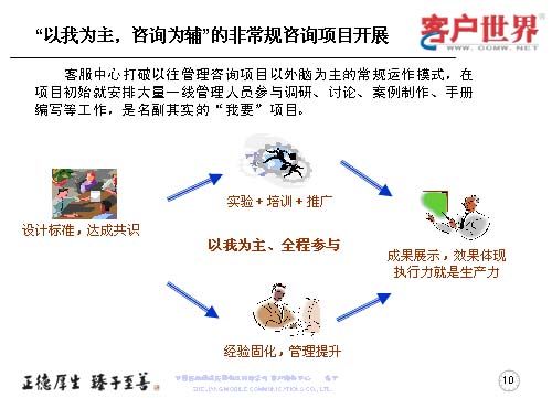這個(gè)管理咨詢項(xiàng)目開(kāi)展中,是以我為主,咨詢?yōu)檩o的非常規(guī)咨詢項(xiàng)目,打破的是以外腦為主的常規(guī)運(yùn)作模式,在項(xiàng)目初期就有大量的一線管理人員參與調(diào)研、討論、案例制作、手冊(cè)編制,是名副其實(shí)的“我要”項(xiàng)目。那么在這個(gè)方面我們分成了三部曲,設(shè)計(jì)標(biāo)準(zhǔn)、達(dá)成共識(shí),通過(guò)實(shí)驗(yàn)加培訓(xùn)推廣,以我為主的全程參與,來(lái)固化經(jīng)驗(yàn),提升管理。最后成果展示,效果體現(xiàn)于執(zhí)行力,彰顯出生產(chǎn)力。