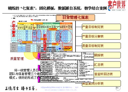 我們精煉了這么七張表的方式,運(yùn)用三個(gè)維度:產(chǎn)量管理、質(zhì)量管理和團(tuán)隊(duì)與信息管理,而這些基礎(chǔ)數(shù)據(jù)都來(lái)自于系統(tǒng),教學(xué)和案例。而七張表是從產(chǎn)量、質(zhì)量和團(tuán)隊(duì)信息來(lái)展現(xiàn)出具體的一些應(yīng)用,將一線管理人員從日常工作的三個(gè)維度入手,形成七張表管理模式,很好地具備了操作標(biāo)準(zhǔn)和規(guī)范。這模板表除了系統(tǒng)出來(lái)的一些數(shù)據(jù)以外,通過(guò)我們基層管理人員的項(xiàng)目執(zhí)行和跟蹤檢查,形成一些案例,改進(jìn)計(jì)劃和改進(jìn)意見(jiàn)。這幾張表多為系統(tǒng)自身所產(chǎn)生一些具體的數(shù)據(jù),比如說(shuō)上個(gè)月的指標(biāo)值如何設(shè)定,實(shí)際達(dá)成的產(chǎn)量怎樣,回訪滿意率具體有哪些數(shù)據(jù),都在客服系統(tǒng)的報(bào)表中提煉出來(lái)的相關(guān)數(shù)據(jù)。