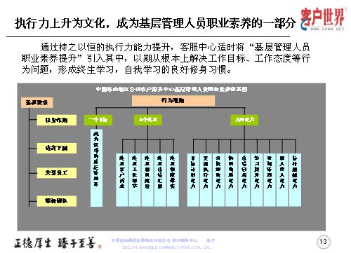 在執(zhí)行力上升文化的同時(shí),基層管理者的職業(yè)素養(yǎng)是我們時(shí)刻去追求的,所以客服中心適時(shí)地將基層管理人員的職業(yè)素養(yǎng)引入到其中,以期從根本上解決工作目標(biāo)、工作態(tài)度等問(wèn)題,形成終生學(xué)習(xí),自我學(xué)習(xí)的良好修身習(xí)慣。這是我們客服中心基層管理人員職業(yè)素養(yǎng)的一個(gè)體系圖,首先從素養(yǎng)要求的四個(gè)維度,行為準(zhǔn)則的一、五、九來(lái)展現(xiàn)。一個(gè)目標(biāo)是成為優(yōu)秀的管理者,五個(gè)注重是注重客戶需求、注重工作細(xì)節(jié)、注重團(tuán)隊(duì)建設(shè)、注重總結(jié)匯報(bào)、注重制度落實(shí)。九種能力:目標(biāo)計(jì)劃能力,貫徹執(zhí)行能力、分析解決能力、協(xié)調(diào)溝通能力、總結(jié)創(chuàng)新能力、時(shí)間管理能力、師人育人能力和標(biāo)桿超越能力。這個(gè)一、五、九,讓它彰顯出素養(yǎng)和表現(xiàn)的四個(gè)維度,以身作則、培育下屬、關(guān)愛(ài)員工和鍛造團(tuán)隊(duì)。